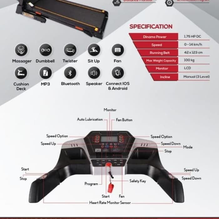 • Safety key untuk keamanan, multi fungsi dengan alat bantu sit up push up, 2 dumbell, twister untuk melengkapi kegiatan olahragamu